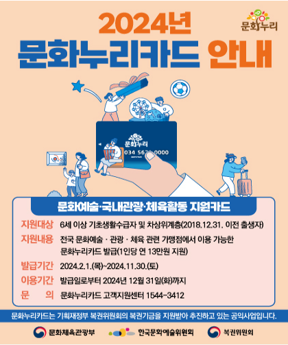 - 문화누리카드 발급기간 : 2024.02.01 ~ 2024.11.30
